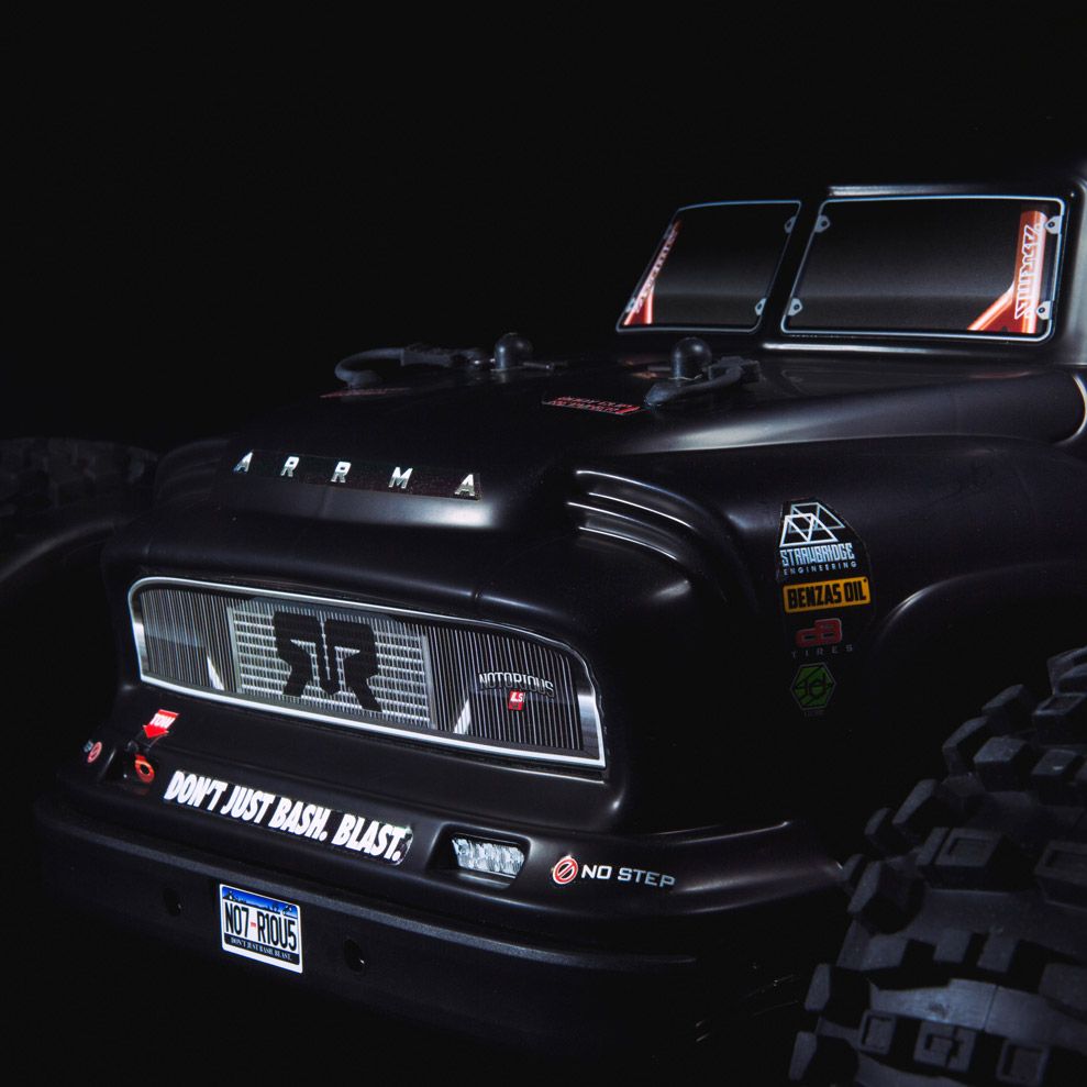 The ARRMA NOTORIOUS mixes classic style and extreme performance in a proven, ARRMA-tough design. Choose from blue or matte black body colors.