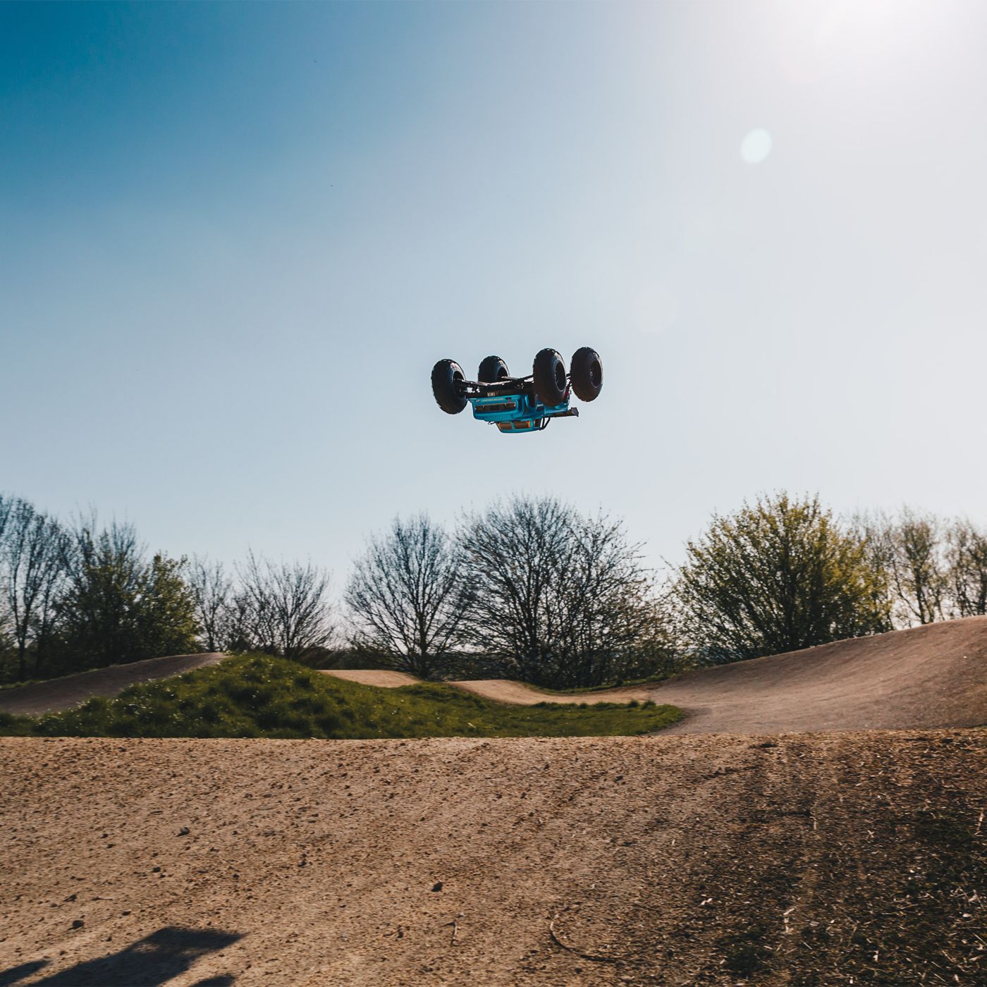 To increase the truck’s sensitivity to throttle and brake input, ARRMA designers specified a short wheelbase and large diameter, chunky tread Back Flip tires from dBoots. That makes back flips, front flips, and similar stunts a snap to perform.
