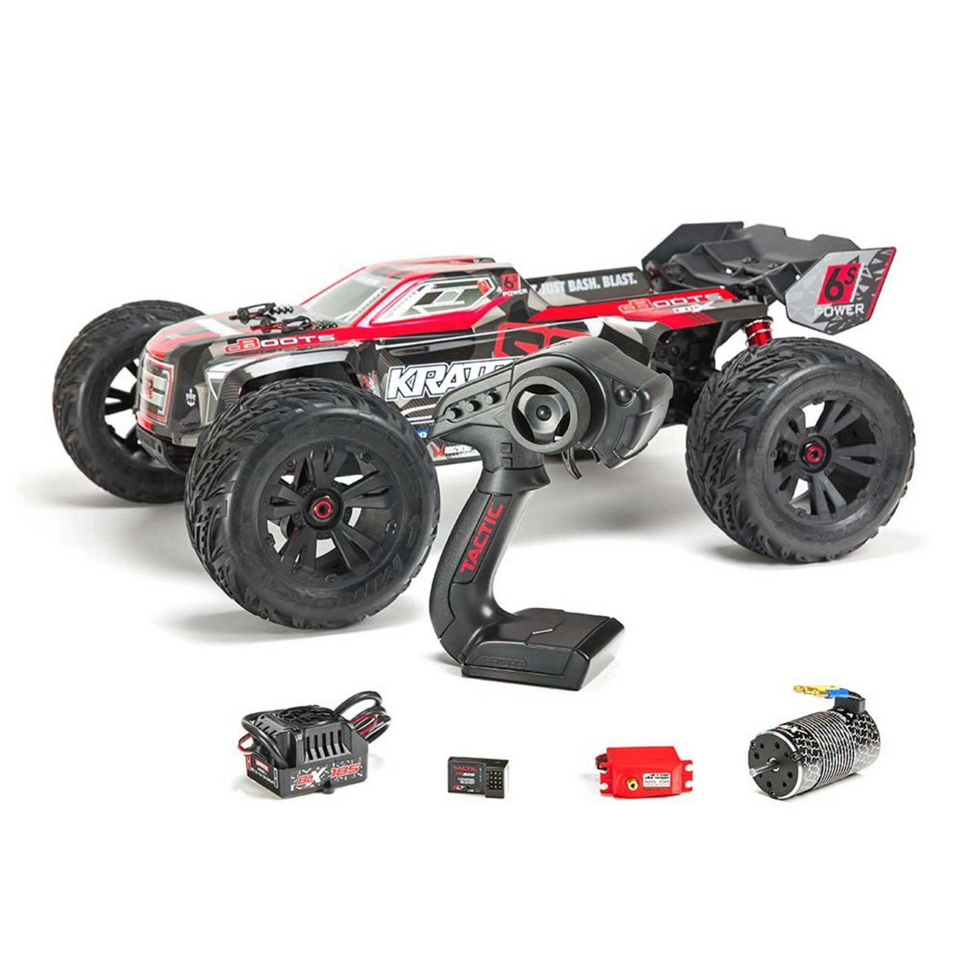 • (1) RTR Kraton 6S BLX Speed Truck with Painted Body, 2.4GHz Radio, Waterproof Steering Servo and Receiver Box, BLX185 ESC, 2050Kv Brushless Motor, 12T Pinion Gear, (2) XT90 Battery Connectors and Bridging Wire for single pack use
